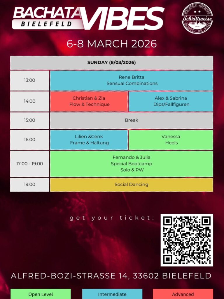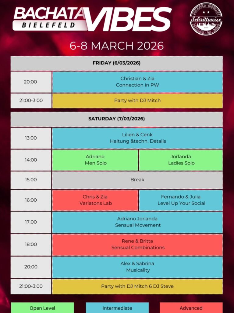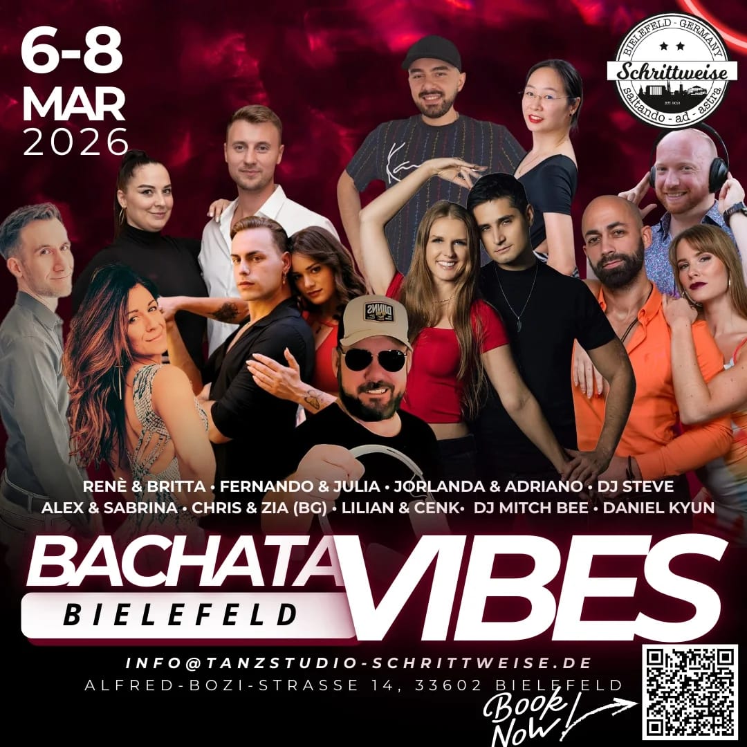 Bei unserem neuen Festival Bachata Vibes erwartet euch vom 6. bis 8. März ein ganzes Wochenende Bachata bei uns in Bielefeld. Wir haben unsere Kontakte spielen lassen und bieten euch von Freitag bis Sonntag verschiedenste Workshops bei überragenden Artists an. 🙌